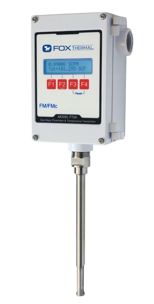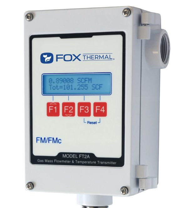 The Fox Model FT2A measures the mass flow of gases directly in Standard Cubic Feet per Minute (SCFM), Normal Cubic Meters per Hour (NM3H), Kilograms per Hour (Kg/Hr), and other mass units with out the need of pressure or temperature compensation. Isolated 4 to 20mA and pulse outputs are standard.